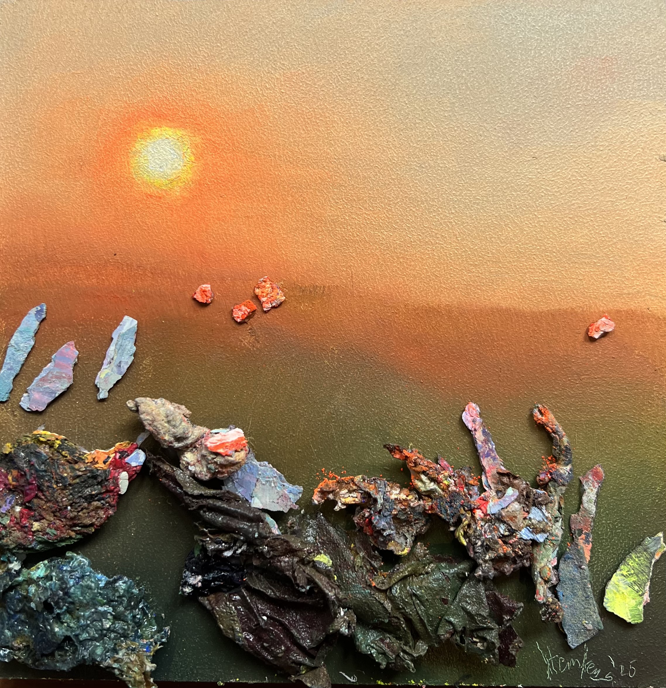 My series “Fossils” of 4 Years work is one of my most exciting creations. My palette is a 2 meter long glass table top, on which layers of paint have been accumulated over 4 years. I thought it was time to get rid of the layers of paint that had dried on the glass. I was able to peel off some exciting pieces, a mix of all shades of the colour spectrum. That’s when the idea popped up that it would be fun to incorporate it into my new work in the right context.